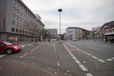 La plaza presenta ángulos específicos que enmarcan la Catedral de Mainz contra el perfil de la ciudad en alineaciones geométricas.