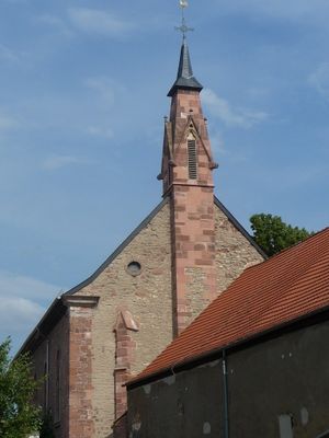 St. Remigius es una iglesia gótica en Osthofen con una torre de piedra en el lado oeste, sostenida por dos ménsulas sobre un arco apuntado. La torre está reforzada por contrafuertes góticos que estabilizan la estructura.
