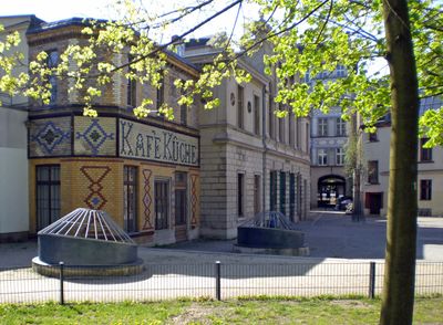 El edificio neobarroco contiene múltiples espacios de lectura, incluyendo un jardín y el Salón de los Querubines de 1912 junto al río Panke.