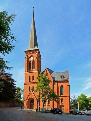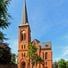 La iglesia neogótica de ladrillo rojo se eleva sobre el centro de la ciudad con un coro poligonal orientado al norte y una torre campanario al suroeste.