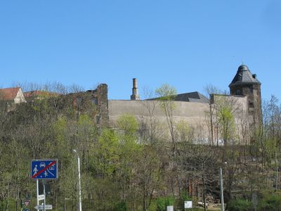 Los restos de piedra del Castillo de Plauen se encuentran en la calle Amtsberg, mostrando elementos arquitectónicos de construcción defensiva medieval.
