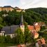 La iglesia de San Bartolomé, con sus tres naves, se eleva en la ladera bajo el Gran Castillo, cerca de la plaza del mercado en el casco antiguo.