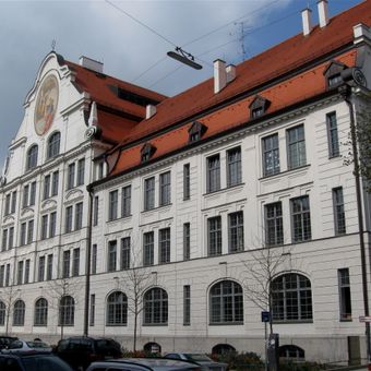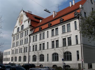 Volksschule an der Stielerstraße, neubarocker Gruppenbau, 1897–99 von Carl Hocheder, am Südgiebel Mosaik von Waldemar Kolmsperger, mit Bavariaring 39