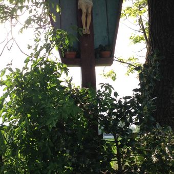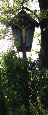 Wegkreuz, gefasster hölzerner Kruzifix mit Wettermantel, 19./20. Jahrhundert