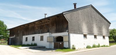 Gstadter Straße 7, bundwerkstadel mit Flachsatteldach, Mitte 19. Jahrhundert, und überbautem Getreidekasten in Blockbauweise, 18. Jahrhundert