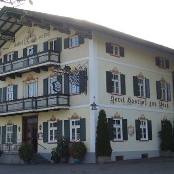 Hotel Gasthof zur Post, stattlicher zweigeschossiger Flachsatteldachbau mit Kniestock, Putzbandgliederung und giebelseitigen Balkons, erbaut 1864