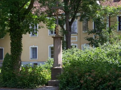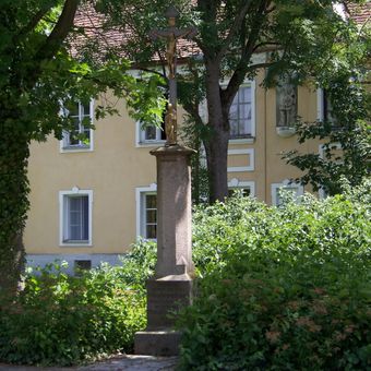 Wegkreuz, bezeichnung: „Denkmal gestiftet von der Magdalena Kiendl, Ausnahmbäuerin v. hier. Errichtet von Michael u. Theres Fischer im Jahre 1875“