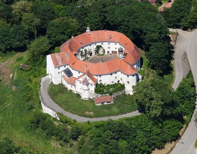 Schloss Wildenberg es un castillo medieval con una muralla anular conservada y una torre bergfried colocada diagonalmente en la ladera. La torre fue construida estratégicamente para supervisar toda la fortificación desde su ubicación elevada.