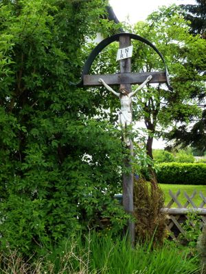 Wegkreuz, gusseiserner Corpus auf hölzernem Kreuz, 2. Hälfte 19. Jahrhundert