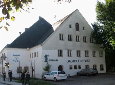 Gasthof zur Post Steinhöring, zweigeschossiger Walmdachbau mit Traufgesims und angesetztem Satteldachbau, 1. Hälfte 19. Jahrhundert, Walmdach nach 1855
