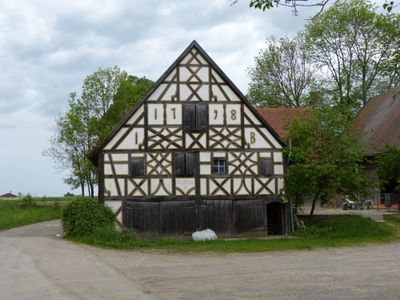 Ottobeurer Straße 1, zweigeschossiger Satteldachbau mit Fachwerk und Ständerbohlen, bezeichnet 1798