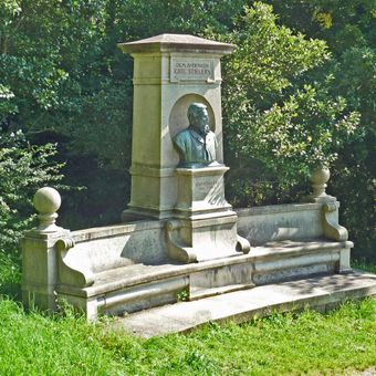 Stieler Denkmal, halbrunde Marmorbank mit Bronzebüste auf hohem mittigen Postament, von Friedrich von Thiersch, 1886/87, Büste von Thomas Dennerlein, 1886