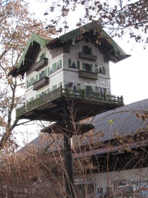 Taubenschlag, Holzkonstruktion in Form eines Bauernhauses, bezeichnet „1926“