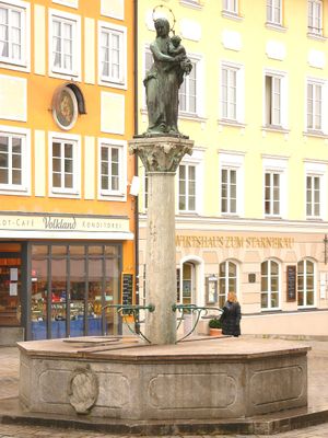 Brunnen, sog. Marienbrunnen, bronzemadonna auf hoher steinernen Sockelsäule inmitten eines oktogonalem Brunnentroges, von Joseph Hillerbrand und Josef Henselmann, 1948