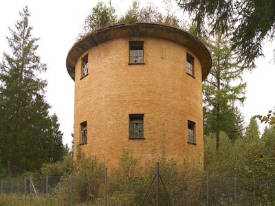 Nitrozellulose-Fabrik, teile der ehemaligen Nitrozellulose-Fabrik, ehemaliges Mischergebäude (Nr. 250), dreigeschossiger Stahlbetonskelettbau mit Ziegelausfachung und weit überstehendem, begrüntem Flachdach;