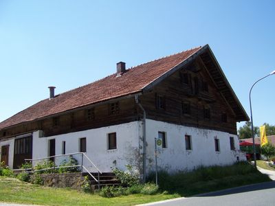 Bauernhaus mit Blockbau-Obergeschoss und Steilsatteldach, building in Wiesenfelden, Lower Bavaria, Germany