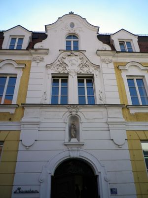 Griesbadgasse 16, 18, institut für Kinderbetreuung und Mädchenausbildung, langgestreckter zweigeschossiger Mansarddachbau mit neubarocker Putzgliederung, Mittelrisalit und Ziergiebel, bezeichnet mit dem Jahr 1902