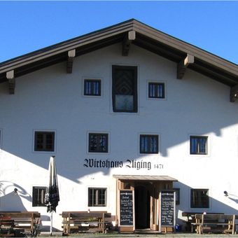 Tafernwirtschaft Aiging, stattlicher Einfirstbau mit Flachsatteldach, am Rotmarmor-Türgewände bezeichnet mit der Jahreszahl 1794