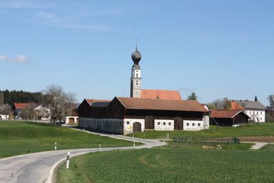 Stattlicher Vierseithof, stattlicher Vierseithof; Wohnstallhaus (Nordflügel), massiv, zweigeschossig mit Kniestock, um 1860/65; Bundwerkstadel (Südflügel) mit reichen Zierformen, bez. 1865; Westflügel, mit gewölbtem Stall und hofseitigem Bundwerk, bez. 1869; Ostflügel,