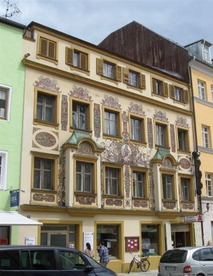 Stadtplatz 12, mit zwei Flacherkern, im Kern 17./18. Jahrhundert, Neurenaissance-Fassadenbemalung durch Josef Widmann, bezeichnet mit dem Jahr 1891