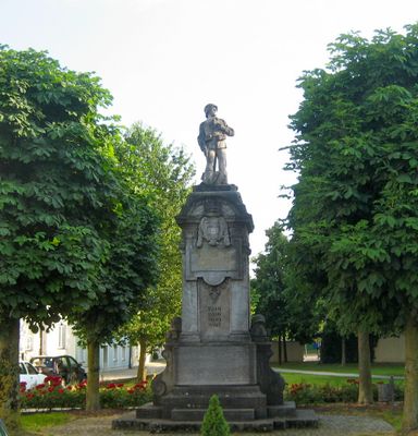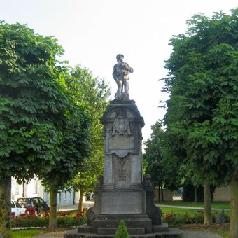 Kriegerdenkmal, zur Erinnerung an die Gefallenen des Erster Weltkrieg, mit Inschrifttafeln nach 1945, seitlich Voluten mit Militaria-Motiven, Soldatenskulptur als Bekrönung, Anfang 20. Jahrhundert