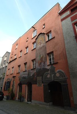 In den Grüben 148, stattliches dreigeschossiges Grabendachhaus mit Vorschussmauer, Wandfresko „Herzog Georg“ um 1934, im Kern 16./17. Jahrhundert