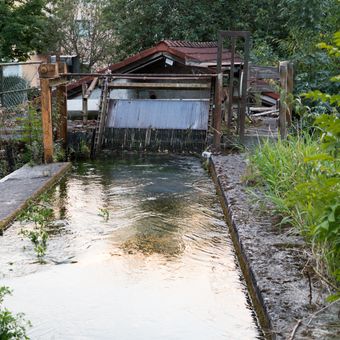 Mittermühlbach, creek near Kraiburg a.Inn, Upper Bavaria. Artificially laid out, set stream with technical facilities as well as canal bridge made of Haustein masonry and substructures near the Mittermühlweg, in today's course