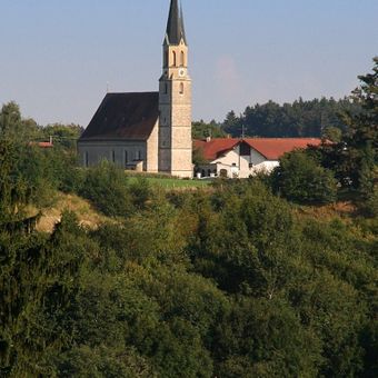 Mariä Himmelfahrt, katholische Filialkirche, gotischer Saalbau aus Tuffquadern mit Polygonalchor und Westturm, 15. Jahrhundert, 1696 barockisiert, 1876 teilweise neugotisch umgestaltet