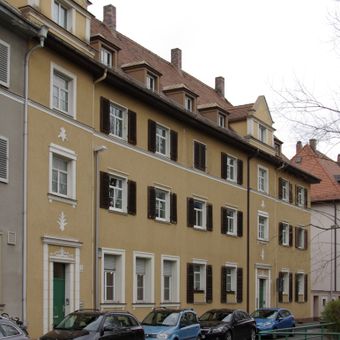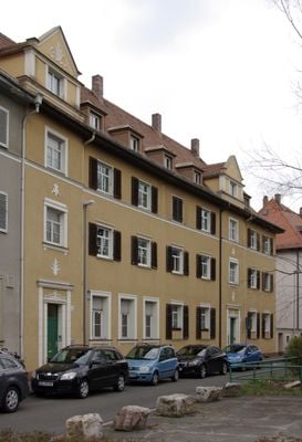 Baugenossenschaftssiedlung an der Nürnberger Straße, dreigeschossiger, verputzter Walmdachbau in Ecklage, mit Zwerchgiebeln, Dachgauben, Putzgliederung und gerundetem Eckerker, nördlich zweigeschossiger Flügelanbau mit Mansarddach, von Emil Zerler, 1927/28