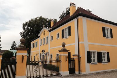 El castillo exhibe una arquitectura de estuco y se encuentra junto a una pequeña plaza a orillas del río Wieseth.