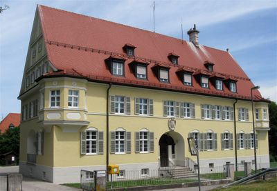 Memminger Straße 18, winkelförmiger, zweigeschossiger Bau in historisierenden Formen mit polygonalen Eckerkern, Treppenturm und Satteldach, 1913