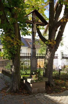 Wegkreuz in Häusling, zugehörig neugotischer Eisenzaun, zweite Hälfte 19. Jahrhundert
