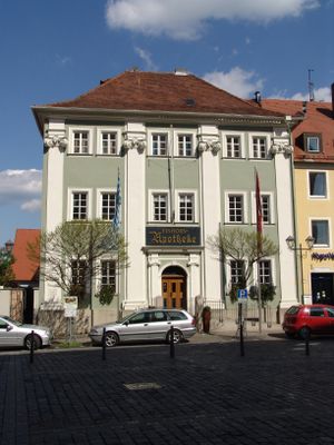 Marktplatz 3, dreigeschossiger Walmdachbau, Pilasterkolossalordnung, Rundbogenportal von Pilastern gerahmt, erste Hälfte 18. Jahrhundert; Einfriedung, Hofmauer mit Zaunsfeldern und Eingangstor, schmiedeeisern, um 1900