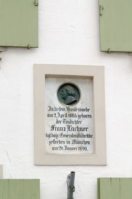 Kirchplatz 7 in Rain am Lech, bezeichnet mit 1890; am Geburtshaus des Tondichters Franz Lachner;