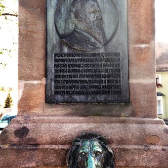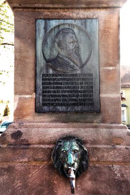 Brunnen, Denkmal für den Bahnbau im Biberttal, obelisk mit kleinem Brunnentrog, wohl um 1914, Plakette bezeichnet „1931“, Modell und Guss Ch. Lenz