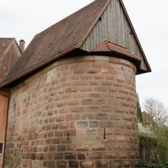 Schäferturm, befestigungsturm, gestelzter, halbrunder und zweigeschossiger Sandsteinquaderbau mit aufgesetztem Steilsatteldach mit verbrettertem Giebel, Mitte 14. Jahrhundert