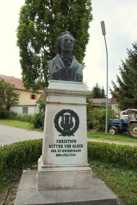 Gluck-Denkmal Weidenwang, sich verjüngende Kalksteinstele mit Inschrift und Bronzebüste auf Marmorsockel, 1870 von Konrad Knoll, München