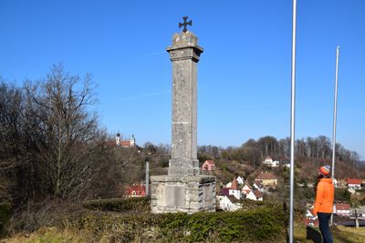 Kriegerdenkmal, rechteckpfeiler auf gemauertem Bruchsteinsockel, mit Inschrifttafeln und bekrönendem Eisernem Kreuz, 1922