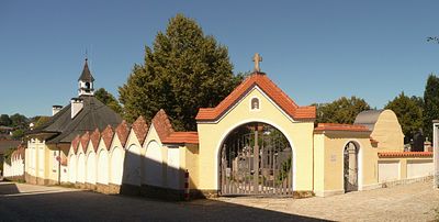 Friedhof, friedhof; Leichenhalle mit Säulenportikus und Glockentürmchen, Walmdachseitenflügeln und Grabmalmauer längs der Pfarrer-Biebl-Straße, 1915; Kriegerdenkmal von 1872