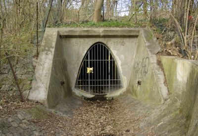 Sturmauslassabzweigung Süßheimweg, unbewehrter Betonstollen mit verklinktertem Gerinne, Stollenmundportal gegen die Pegnitz, bezeichnet „1908–1910“