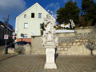 Nepomukfigur, des Johannes Nepomuk mit zwei Putti auf Wappensockel, Kalkstein, spätbarock, Mitte 18. Jahrhundert
