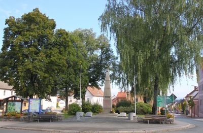 Kriegerdenkmal, granitobelisk mit Balkenkreuzbekrönung auf Stufenpostament, bezeichnet mit „1926“, 1963 für Gefallene des Zweiten Weltkriegs erweitert