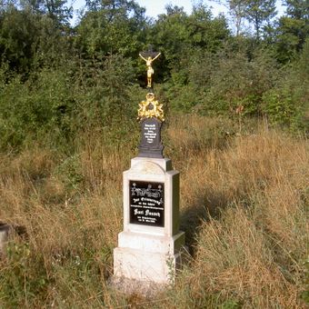 Pauschkreuz, bezeichnet „1907“, Granitsockel mit Schwarzglastafel, Zeichnung in Blastechnik