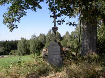 Wegkreuz, gusseisenkruzifix mit trauernder Muttergottes auf gestuftem Granitsockel, Ende 19. Jahrhundert