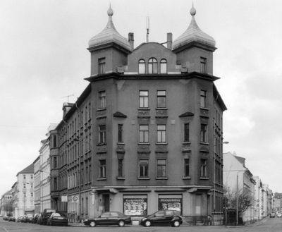 Rolf-Axen-Straße 2, Mietshaus in halboffener Bebauung in Ecklage Gießerstraße mit Läden und Eckturm (Putzfassade; Wandkacheln und Windfangtür im Eingang, Bleiglasfenster im Treppenhaus)