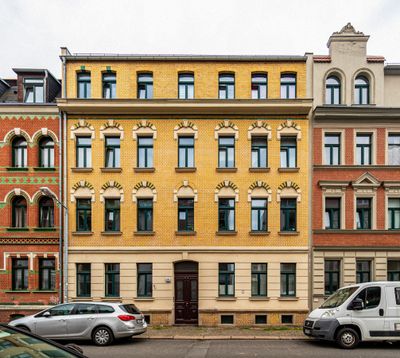 Mietshaus Geraer Straße 9, Mietshaus in geschlossener Bebauung, ehemals mit Laden (Klinkerfassade; geätzte Treppenhausfenster; Holzpaneele im Eingangsbereich)
