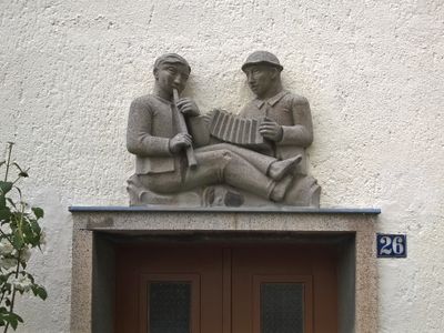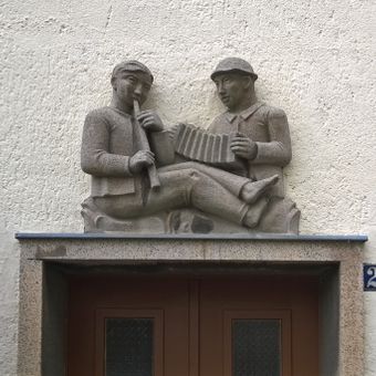 Vier Reliefplatten über den Hauseingängen einer Wohnhauszeile, Gebäude selbst keine Denkmale An der weißen Mauer 22, 24, 26, 28