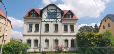 Oschatzer Straße 15, baugeschichtlich von Bedeutung, gründerzeitlicher Putzbau mit straßenbildprägendem Zierfachwerk, Jugendstilornamentik, guter Originalzustand, Gebäude ist saniert, neue Fenster
