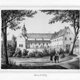 Einzeldenkmale der Sachgesamtheit Schloss, Patronatskirche und Rittergut Miltitz: Schloss und Herrenhaus, in T-Form aneinandergebaut Am Rittergut 3, house in Klipphausen, Germany