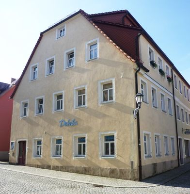 Wohnhaus in bildprägender Ecklage, giebelständig sowie in der links anschließenden Mauer integriertes Sandsteinportal Große Wassergasse 14, house in Dippoldiswalde, Germany
